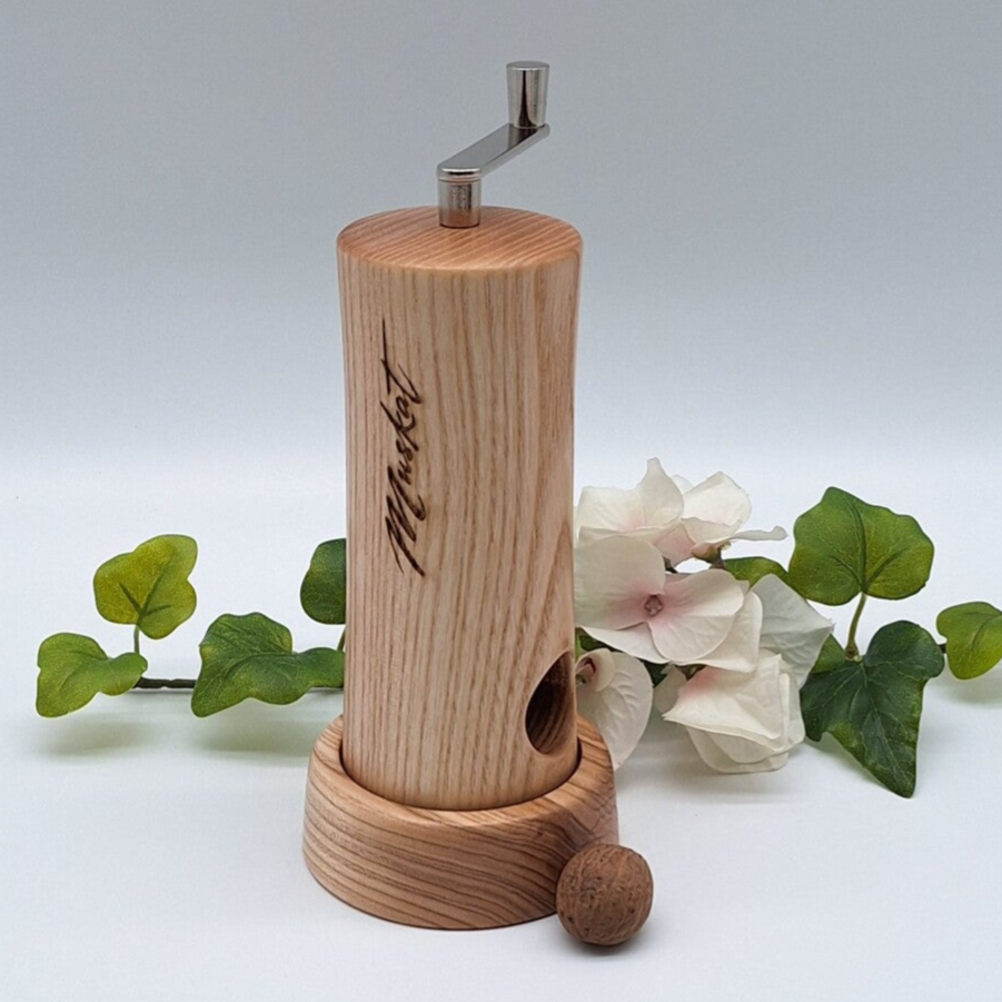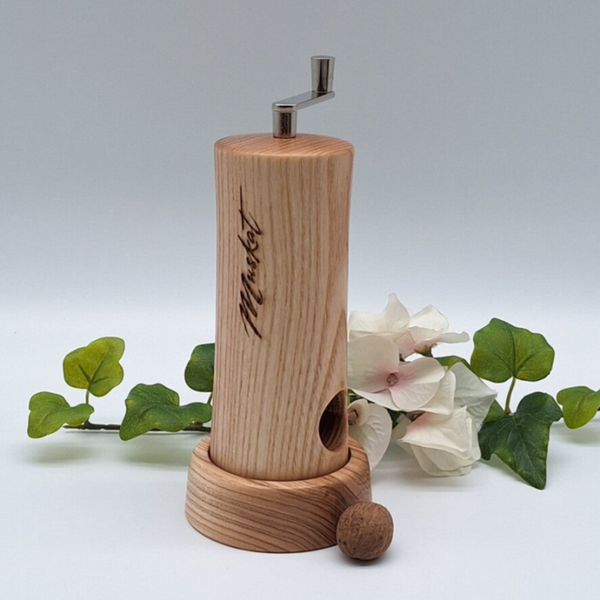 Bei der Mühle aus Eschenholz gibt es noch ein Cooles Highlight: Eine schicke Lasergravur mit dem Schriftzug "Muskat"