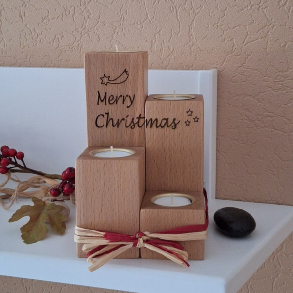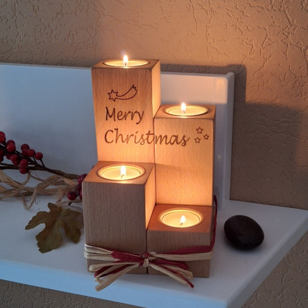 Lieferumfang: Vier Kerzenhalter aus massiv Holz, Vier Teelichttüllen, Vier Teelichter.