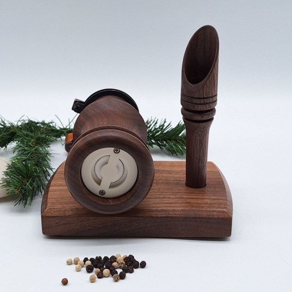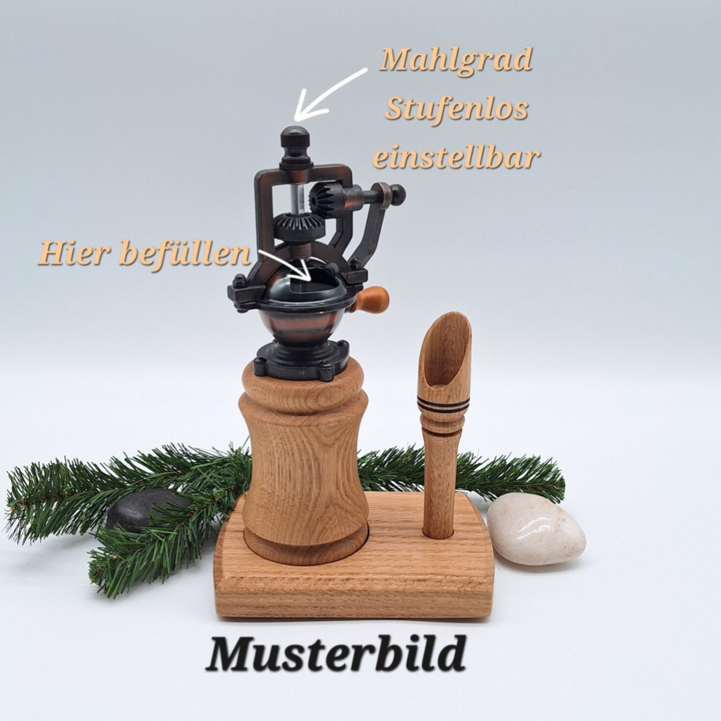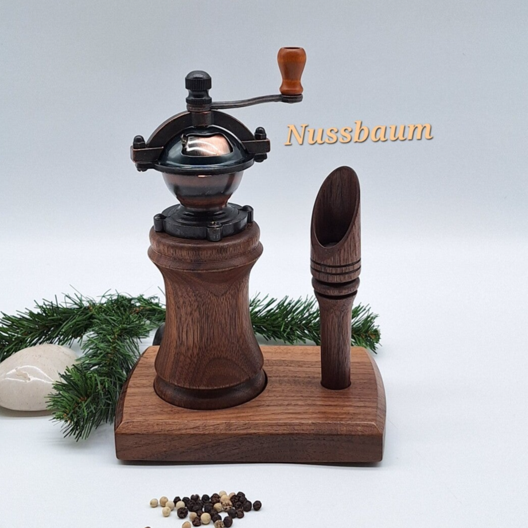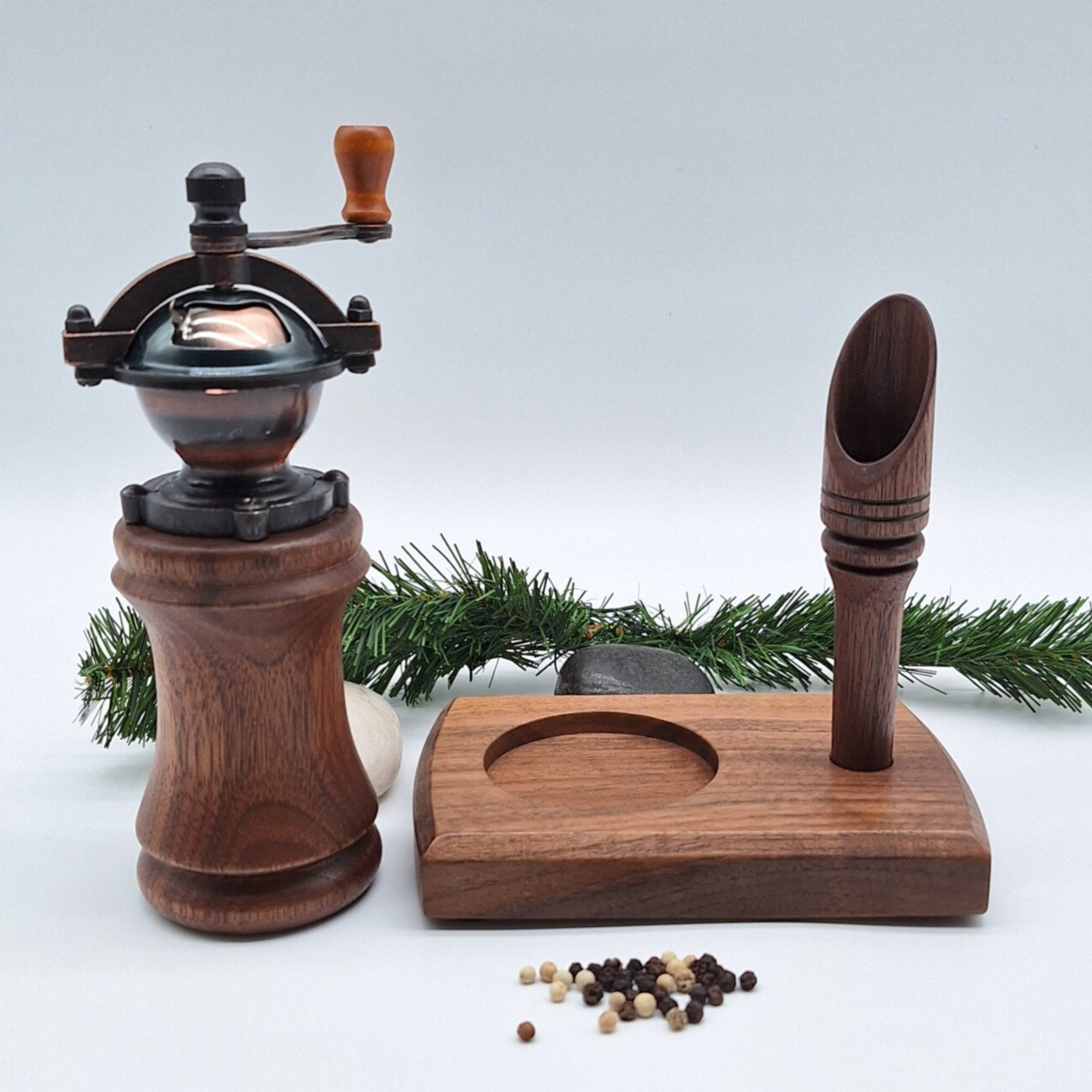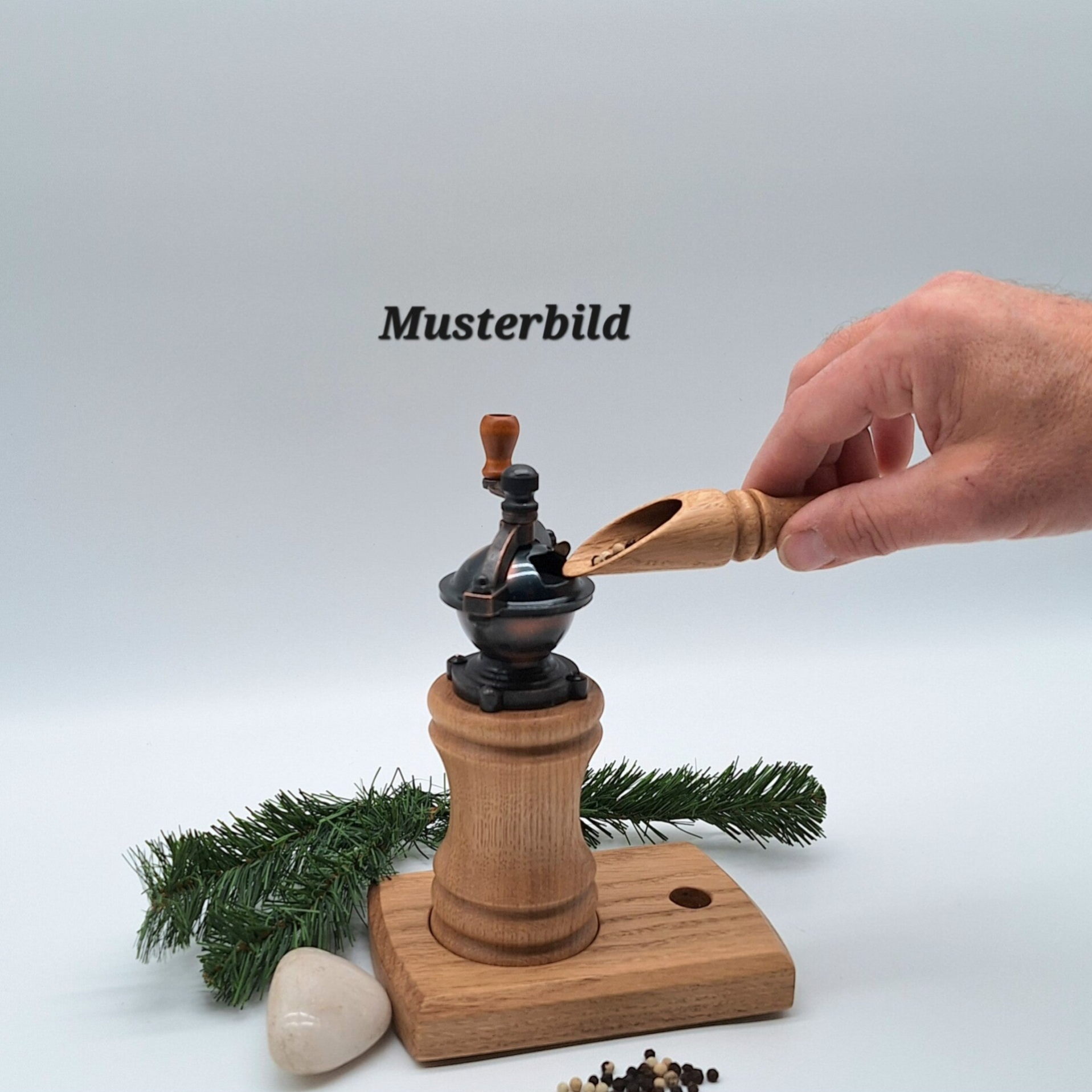 Mit einem handgedrechselten Auffülllöffel ebenfalls aus der gleichen Holzart, können Sie die Pfeffermühle sehr einfach mit Pfefferkörner befüllen.